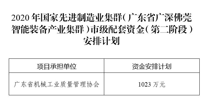根据《广深佛莞共同培育国家先进制造业集群“广东省广深佛莞智能装备产业集群”战略合作协议》,现将2020年国家先进制造业集群(广东省广深佛莞智能装备产业集群)市级配套资金安排计划(第二阶段)予以公示。